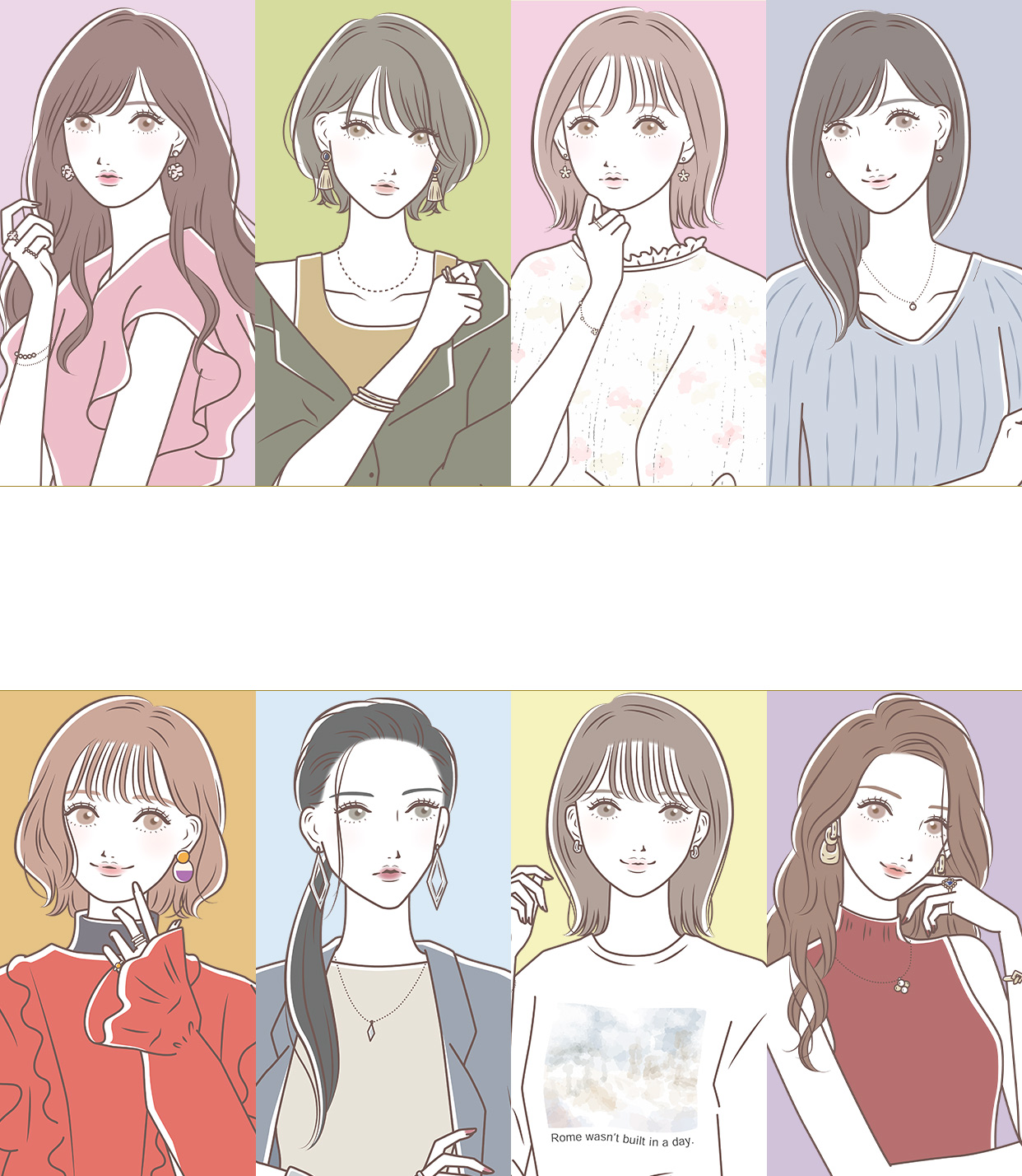 目や口などのパーツの大きさ、位置、形や顔の形状などの顔の特徴によって、 似合うファッションテイストや色を8つに分類したものです。