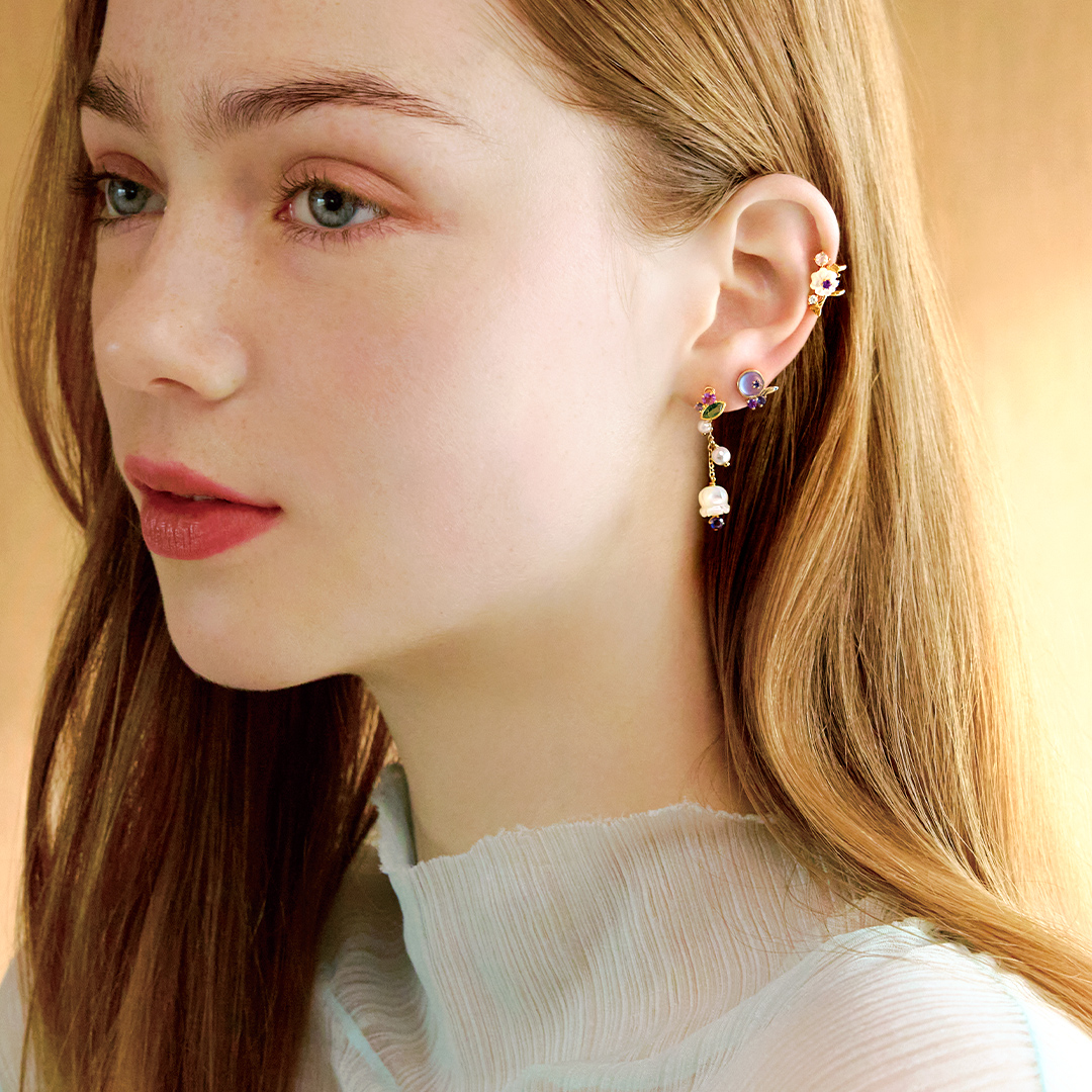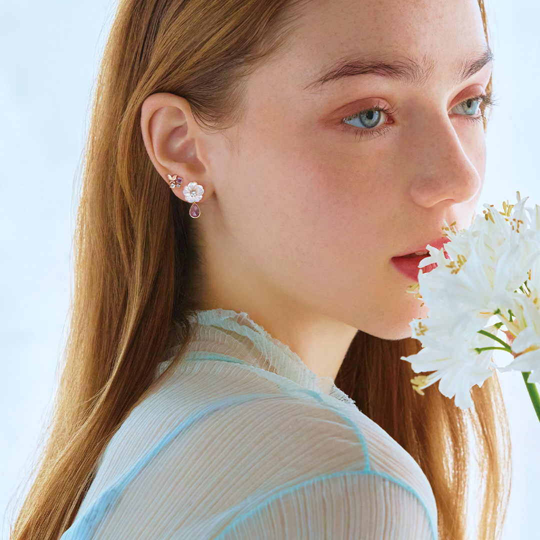上から時計回りに 全てソロピアスK18/K10 カエル YGクリソプレーズ¥23,100 ブルーベリー YGブルークォーツ¥29,700 蝶々 PGアメジスト¥27,500 睡蓮 PGアメジスト¥24,970 雲 YGタンスイパール¥27,500 ミモザ YGハニークォーツ¥27,500 水光 YGブルームーンストーン¥27,500