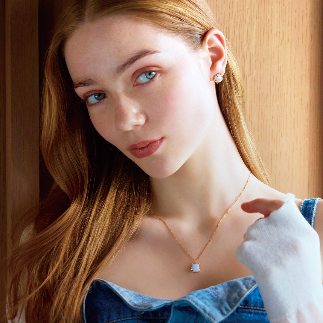 左から ネックレス SV925+YGコーティング,ブルーレースアゲート¥22,000 ピアス K10/SV925+YGコーティング,ブルーレースアゲート¥24,970 ピアス K10/GF/SV925+YGコーティング,ホワイトシェル¥29,700
